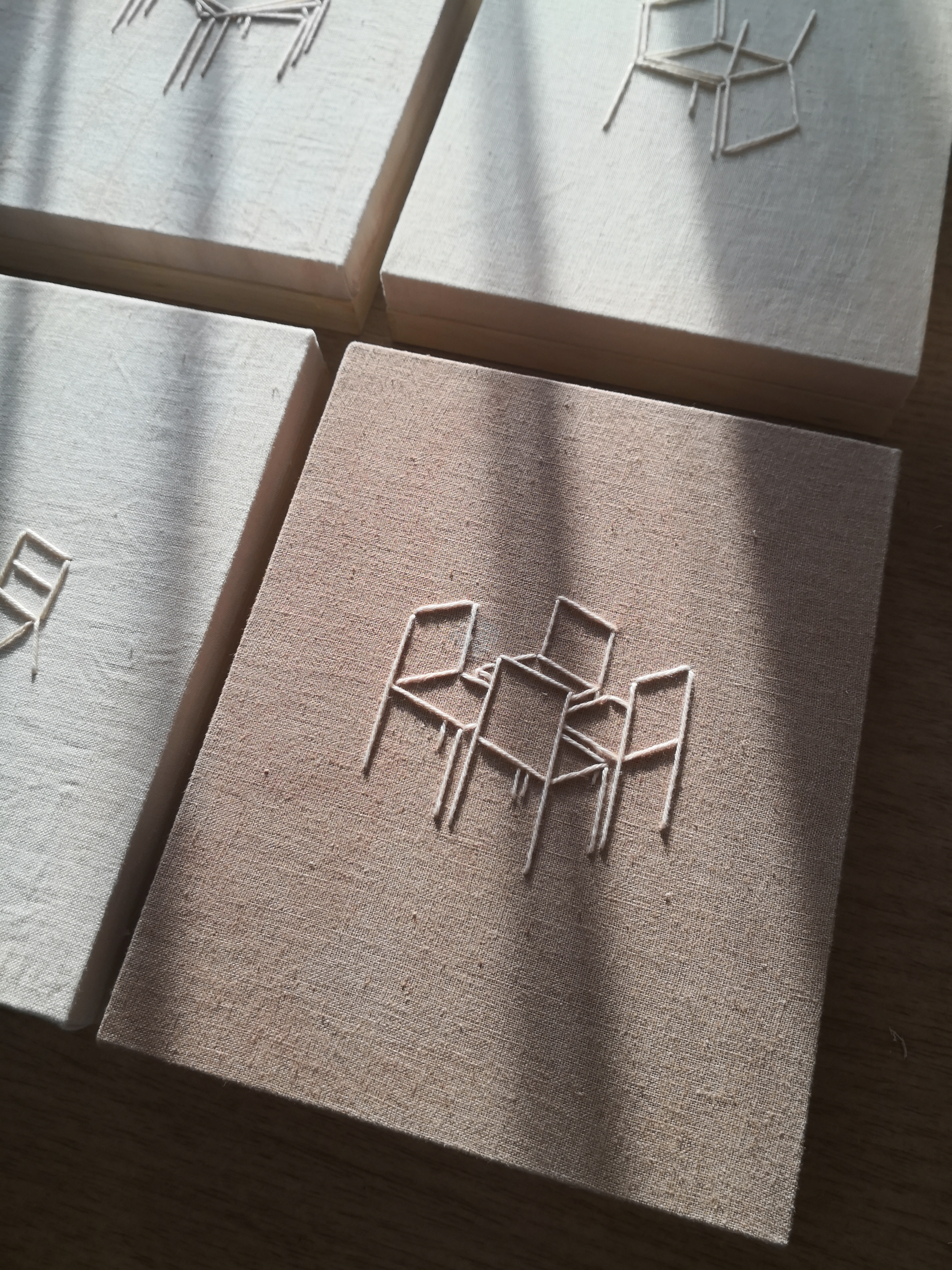 Dibujo lineal que representan composiciones de objetos durante un futuro deshabitado.